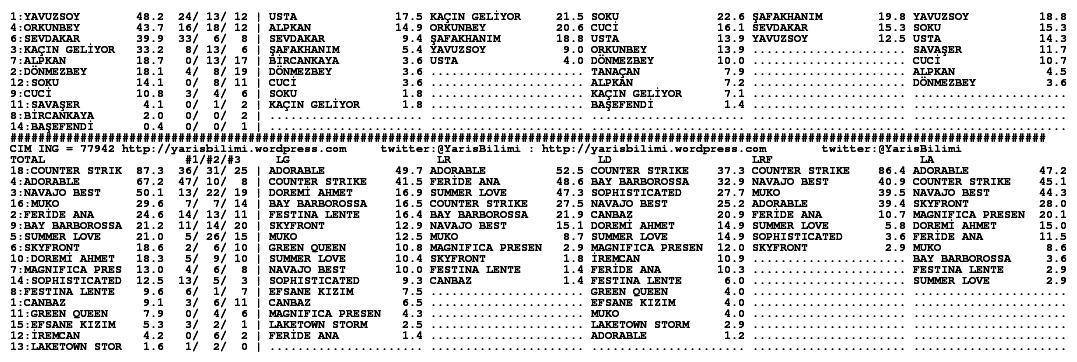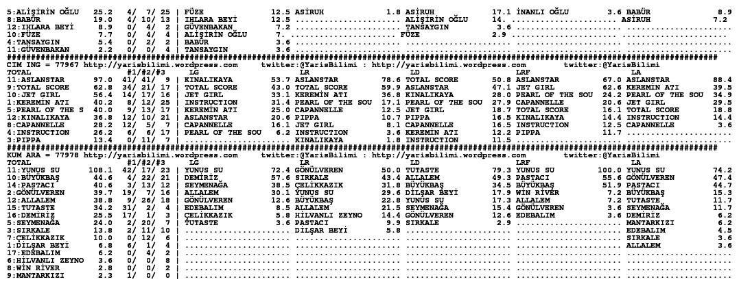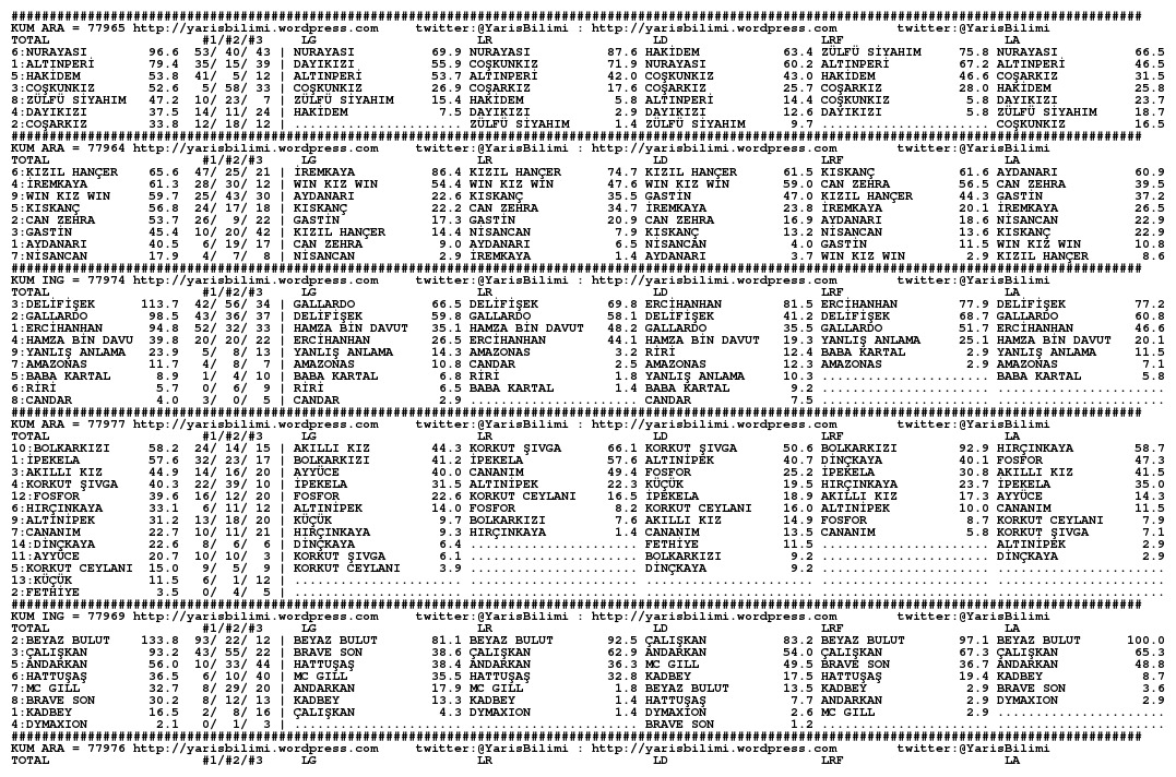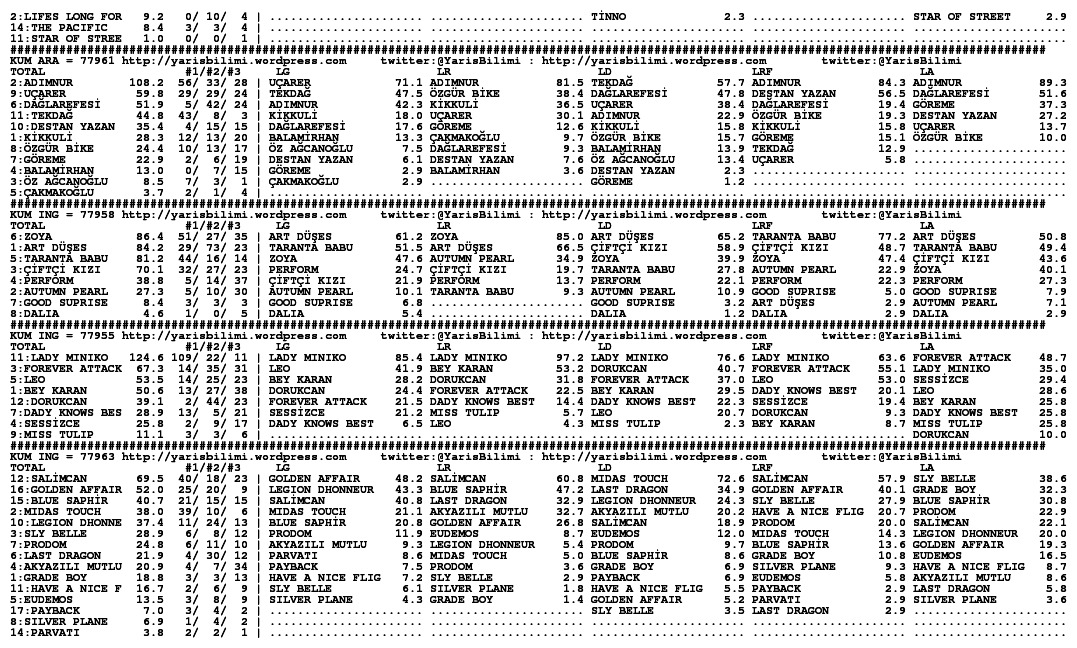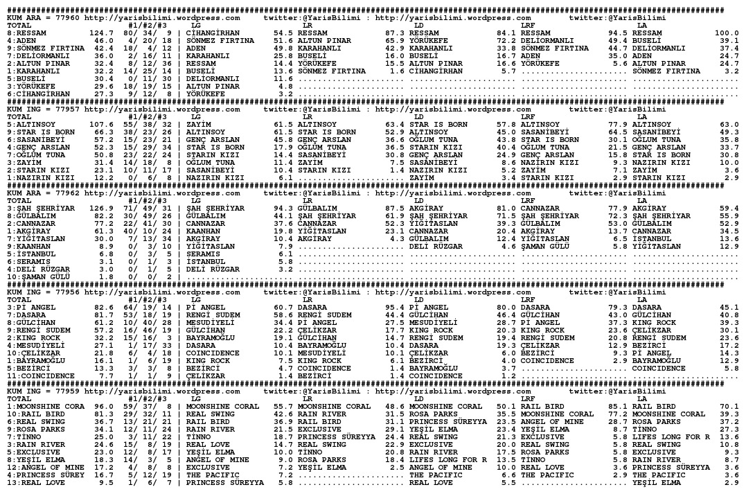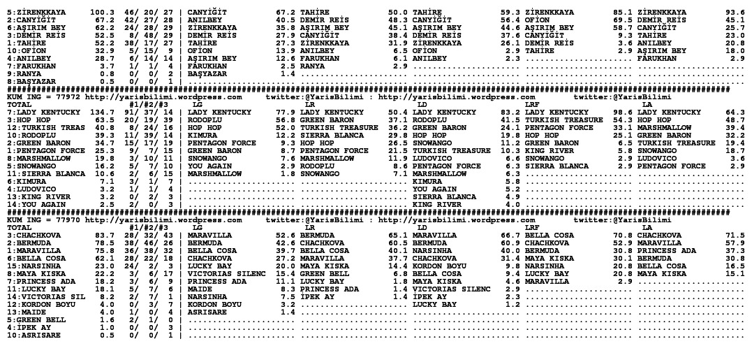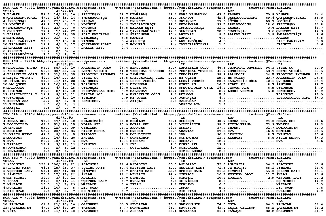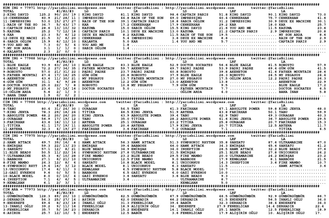30.11.2013.ISTANBUL tahminleri 30 Cumartesi Kas 2013 Posted by yarisbilimi in istanbul, yorum ≈ Yorum bırakın Etiketleristanbul Lady Kentucky artik kosmayacak diyorlar, statistikleri cok iyi olsa da, at sagliksiz durumda olsa gerek. Ilgilerine bol sans, basarili kisraga uzun omurler dileriz.