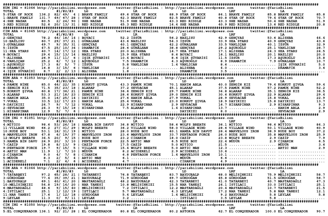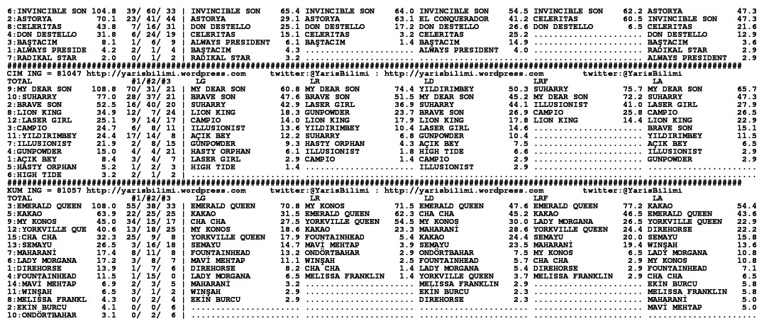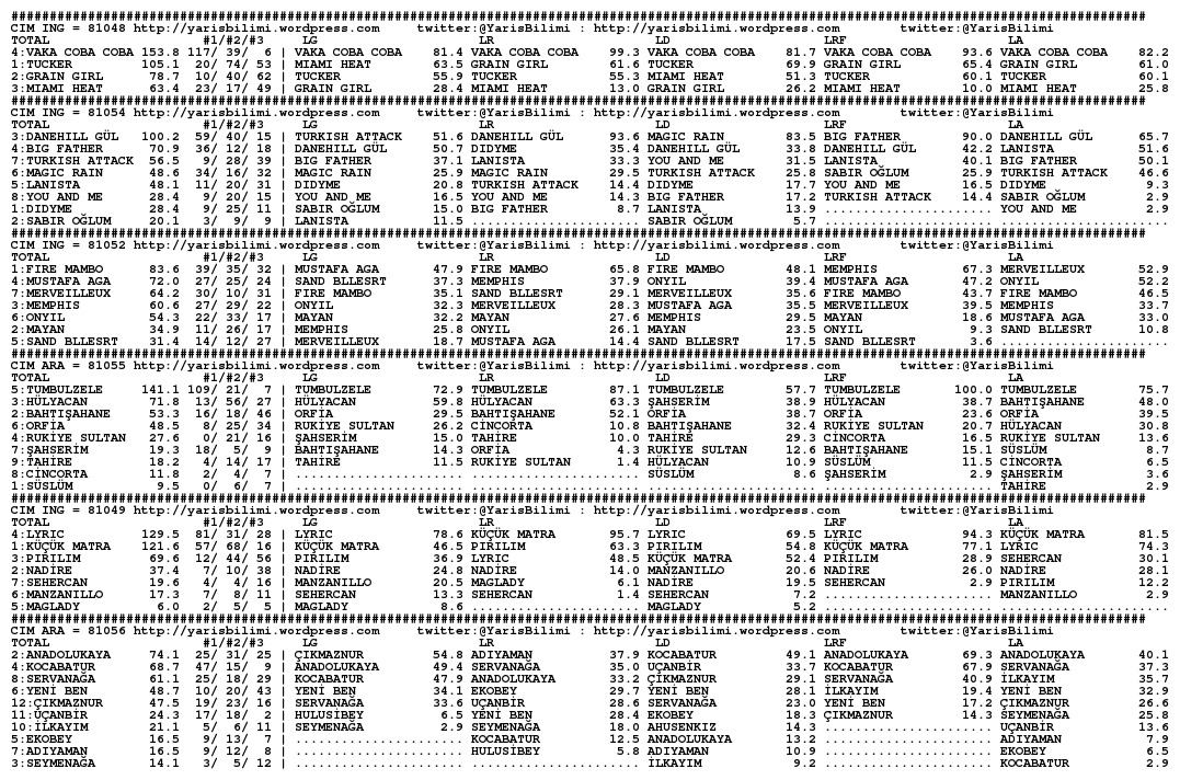 Hala analizi calistiriyorum ama herkesin bekledigi gibi Blaze to Win en cok kazanan oldu simulasyonlarda, Kuloglu da en yuksek puani aldi. Suzi Gold beklendigi gibi yukarida ama beni sasirtan Payitaht ve Inferno. Bu ikili tabelada yuksek ihtimalle olmasini bekledigim Yavuzsel, Enyalios ve Grey Coral’i gecebildi.