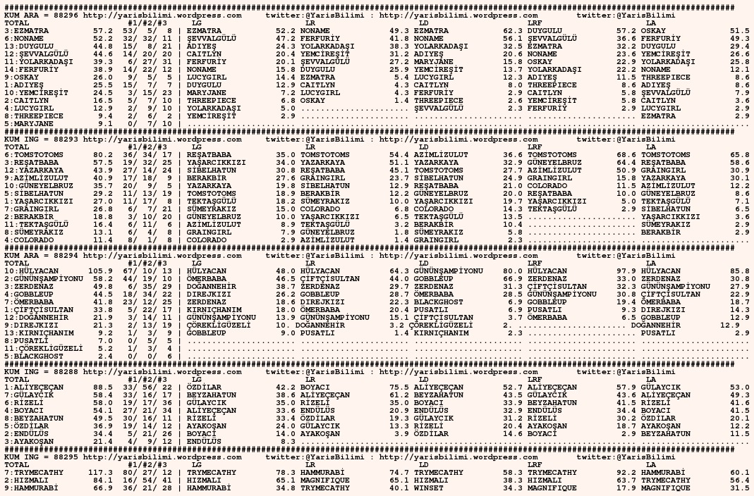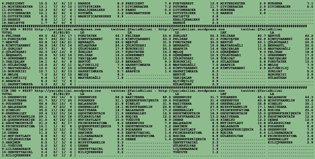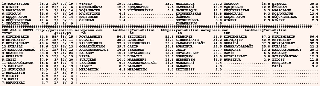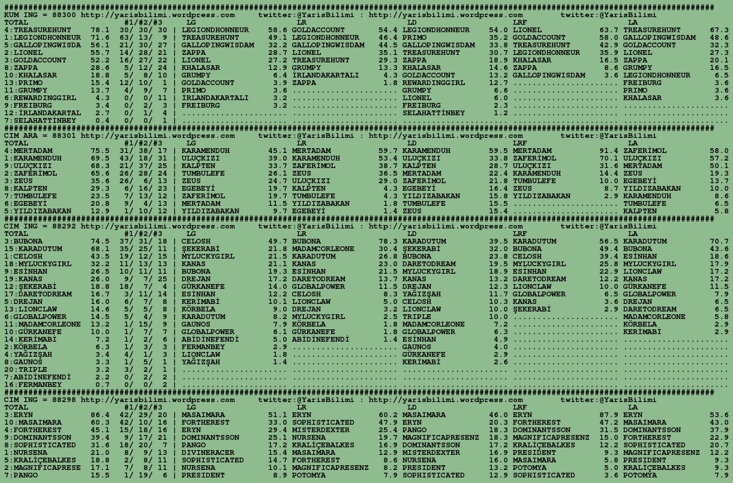 05.10.2015.URFA tahminleri 05 Pazartesi Eki 2015 Posted by yarisbilimi in urfa ≈ 5 Yorum Etiketlerurfa, yorum Taramada hata oldugundan rapor/analiz birbirine girmis. Belki tjk.org sitesindeki HTML kodu, belki de kullandigim parser bozuk cikti. Insallah tekrar olmaz. Kusura bakmayin