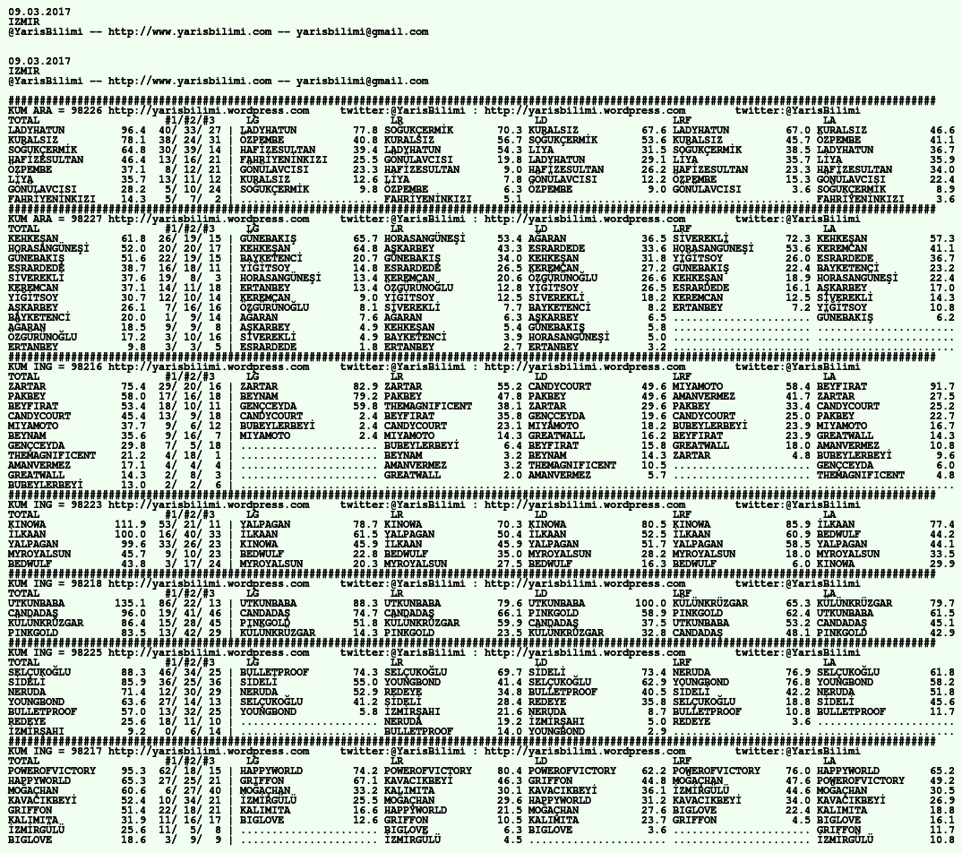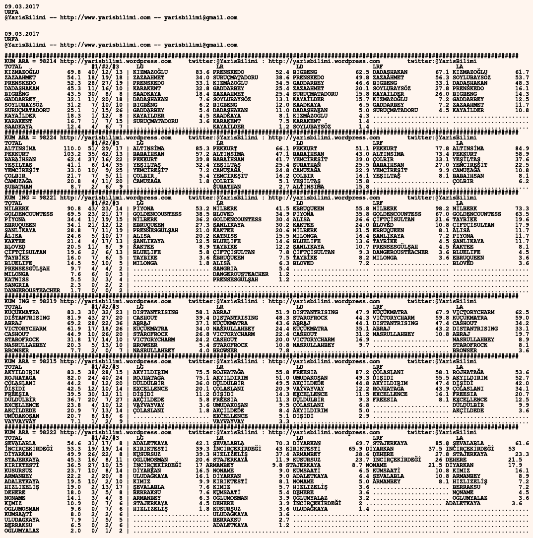 Görsel 09.03.2017.URFA tahminleri 09 Perşembe Mar 2017 Etiketlerurfa Son 2 ayak karışık, düzeltecek vakit yok. Kusura bakmayın Yazan: yarisbilimi | Filed under urfa, yorum ≈ 2 Yorum