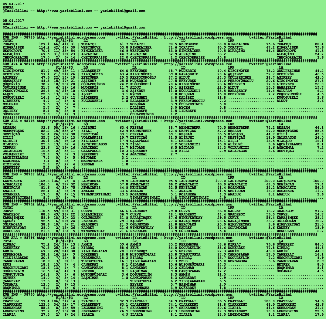 05.04.2017.BURSA tahminleri 05 Çarşamba Nis 2017 Posted by yarisbilimi in bursa, yorum ≈ Yorum bırakın Etiketlerbursa