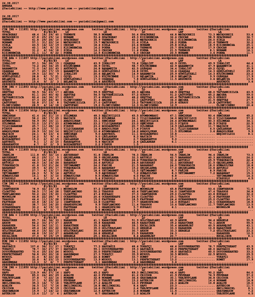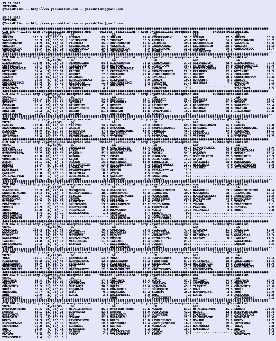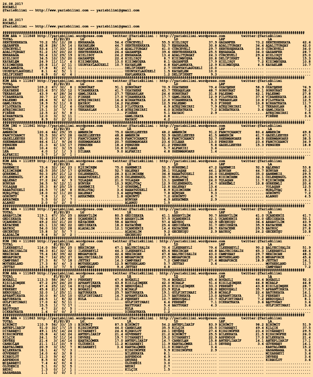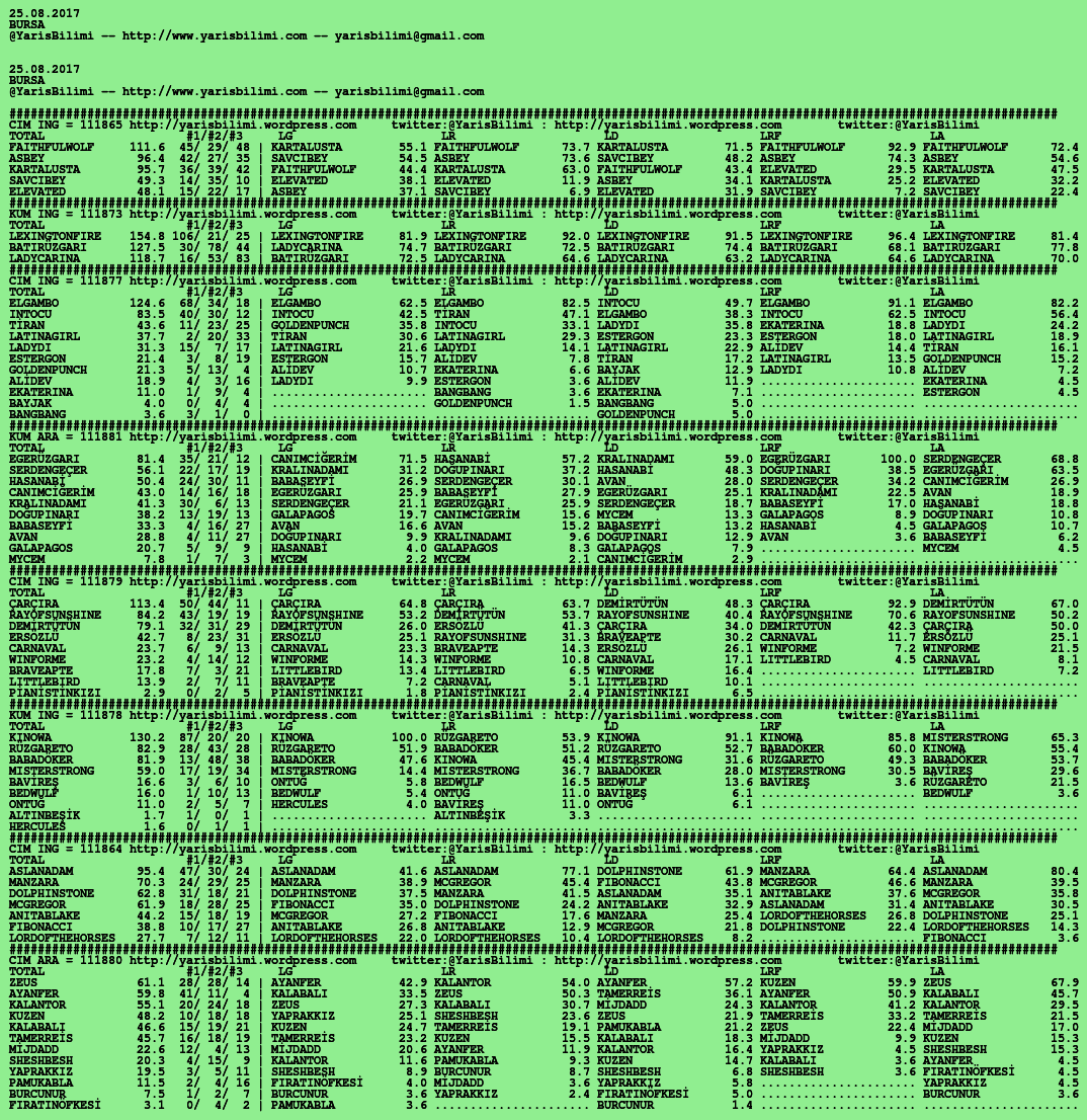 Kendi tercihlerinizi one aliniz. Bu siralamalar sizlere yardim icin hazirlanmaktadir. Ama banko, sablon tercihleriniz kisisel olmali. Eksik verileri olan atlara ozellikle dikkat edilmesini tekrarlar hepinize bol sanslar dileriz.
