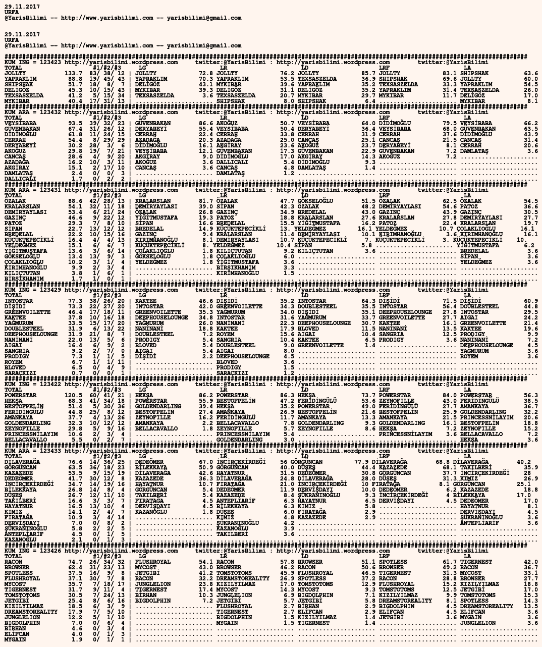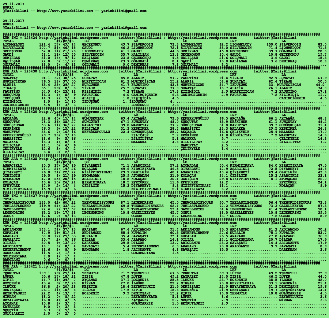 TOTAL sutunu en makul secenek. Simdilik 40 puan ustu seceneklerin sansi cok gorunuyor, ama arap yarislarinda tavsiyem 30 puan ustu. Her analizde, tahminimiz ilk ucunu degerlendirip, her turlu metod ve veri ile yapilmis onlarca simulasyonda cikan atlarin birincilik, ikincilik ve ucunculuk sayisini da (#1/#2/#3) sutunu seklinde belirtiyoruz. Butun kosular geri donusumlu verilere dayali analiz ve simule edilerek, Ilk uc gelmesi muhtemel atlara verilen puanlarla olusturulan sutunlarda mevcut.