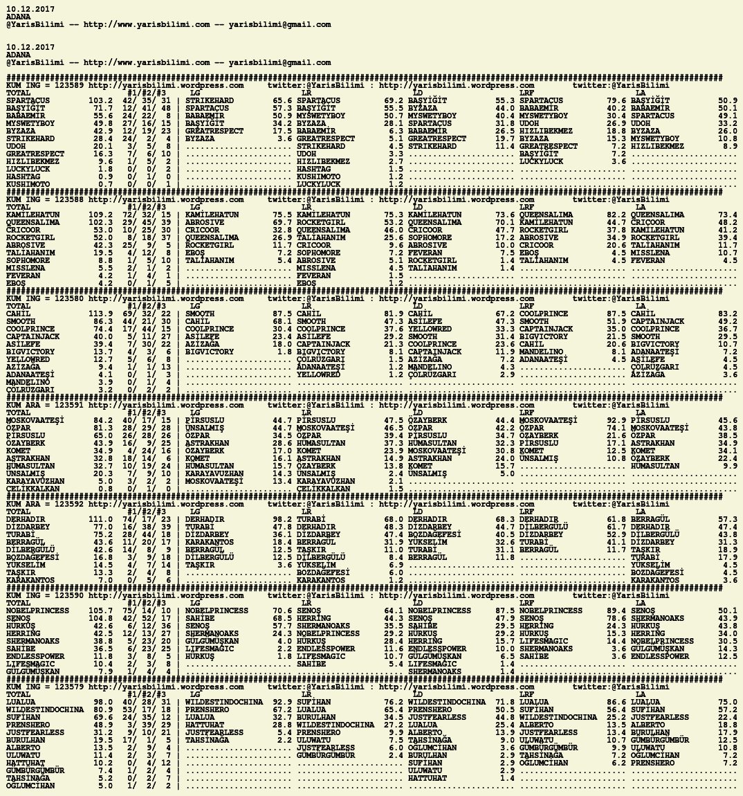 10.12.2017.ADANA tahminleri 10 Pazar Ara 2017 Posted by yarisbilimi in adana, yorum ≈ Yorum bırakın Etiketleradana