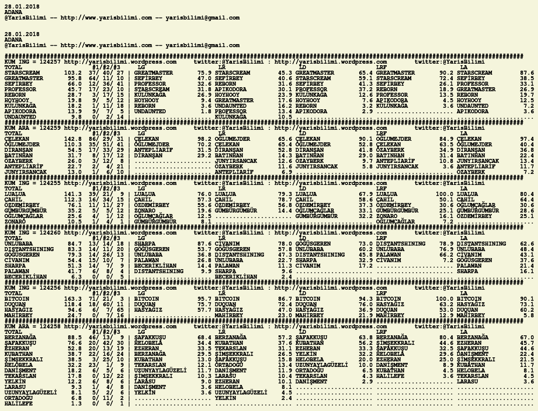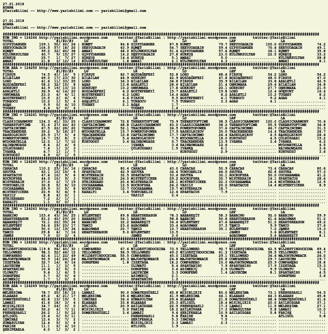 Kendi tercihlerinizi one aliniz. Bu siralamalar sizlere yardim icin hazirlanmaktadir. Ama banko, sablon tercihleriniz kisisel olmali. Eksik verileri olan atlara ozellikle dikkat edilmesini tekrarlar hepinize bol sanslar dileriz.