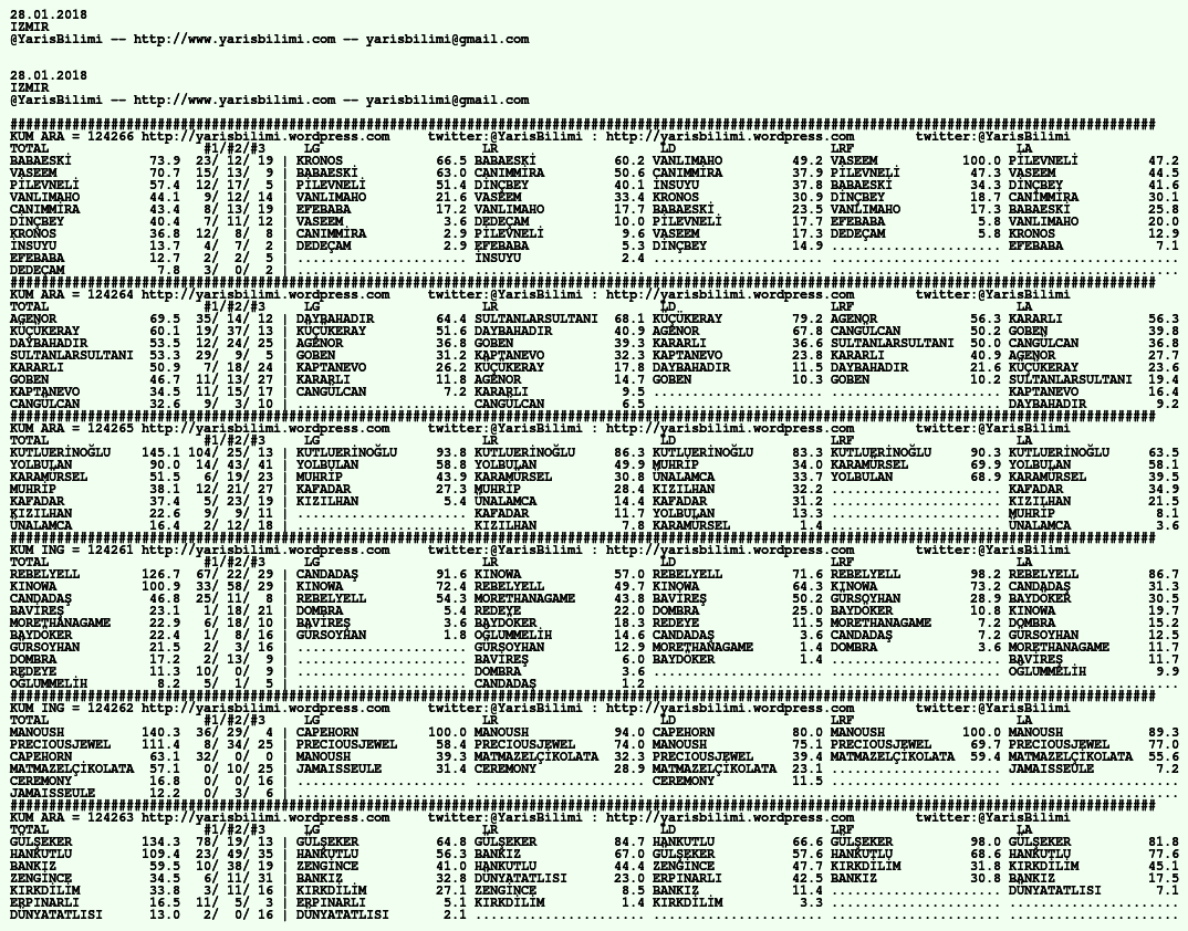 TOTAL sutunu en makul secenek. Simdilik 40 puan ustu seceneklerin sansi cok gorunuyor, ama arap yarislarinda tavsiyem 30 puan ustu. Her analizde, tahminimiz ilk ucunu degerlendirip, her turlu metod ve veri ile yapilmis onlarca simulasyonda cikan atlarin birincilik, ikincilik ve ucunculuk sayisini da (#1/#2/#3) sutunu seklinde belirtiyoruz. Butun kosular geri donusumlu verilere dayali analiz ve simule edilerek, Ilk uc gelmesi muhtemel atlara verilen puanlarla olusturulan sutunlarda mevcut.