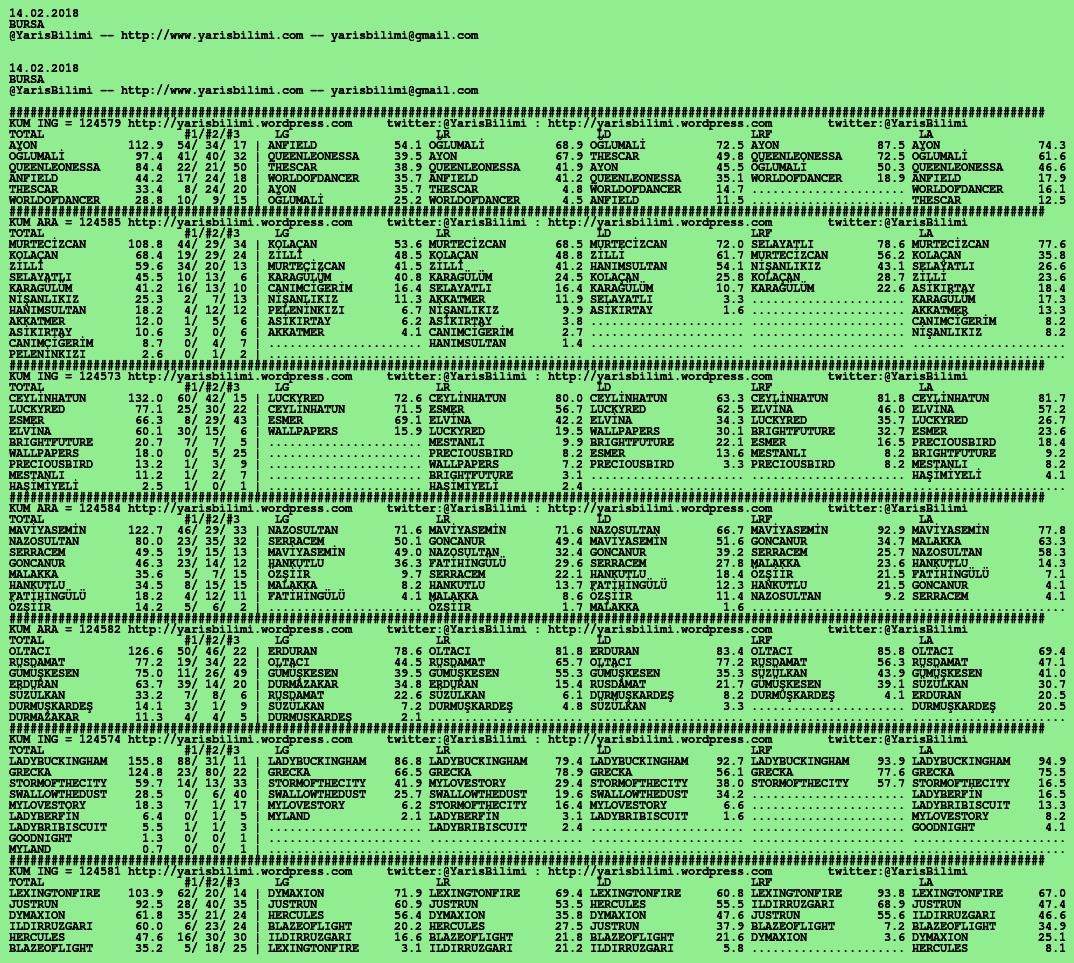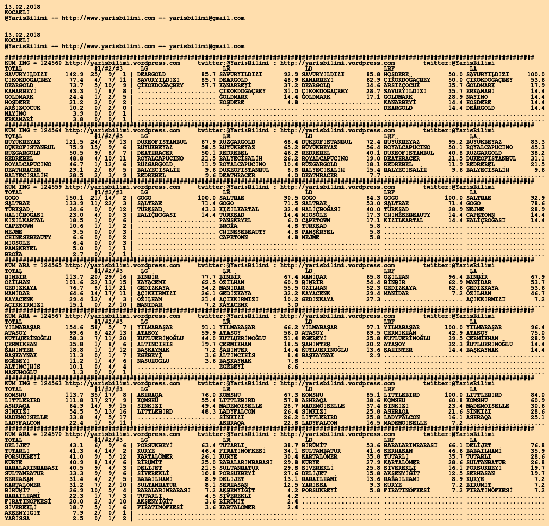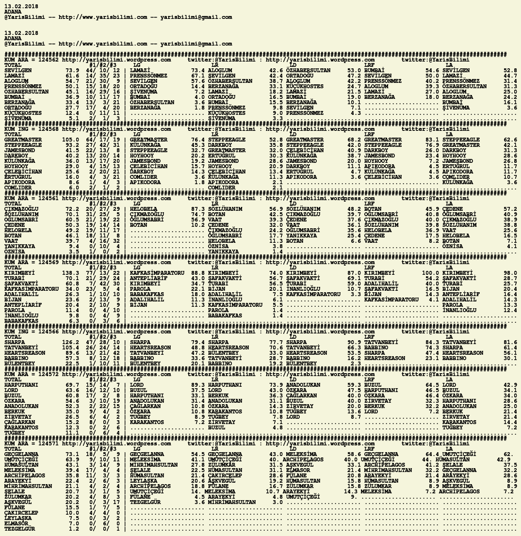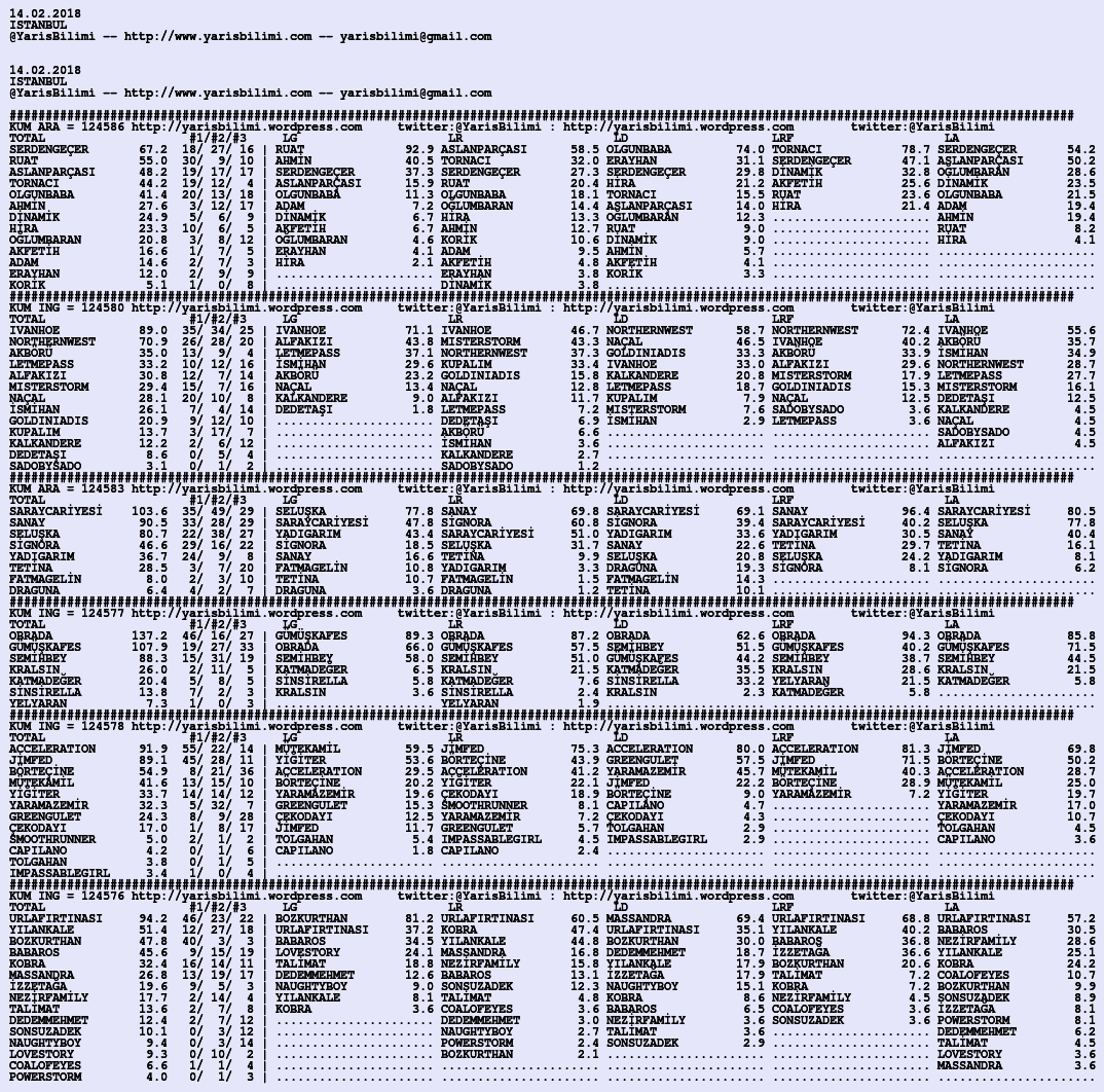 Kendi tercihlerinizi one aliniz. Bu siralamalar sizlere yardim icin hazirlanmaktadir. Ama banko, sablon tercihleriniz kisisel olmali. Eksik verileri olan atlara ozellikle dikkat edilmesini tekrarlar hepinize bol sanslar dileriz.