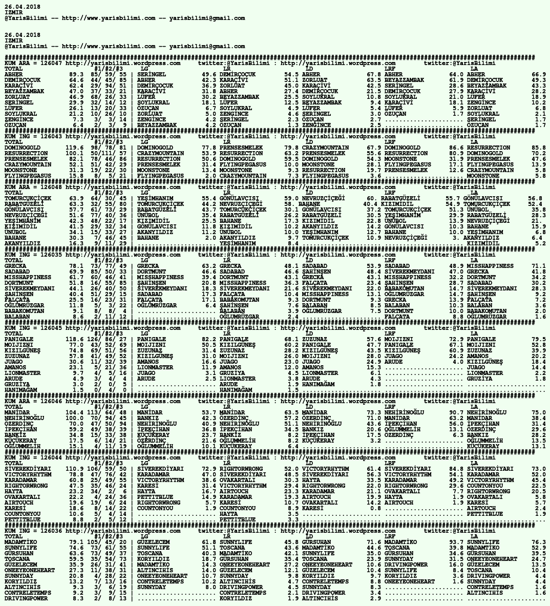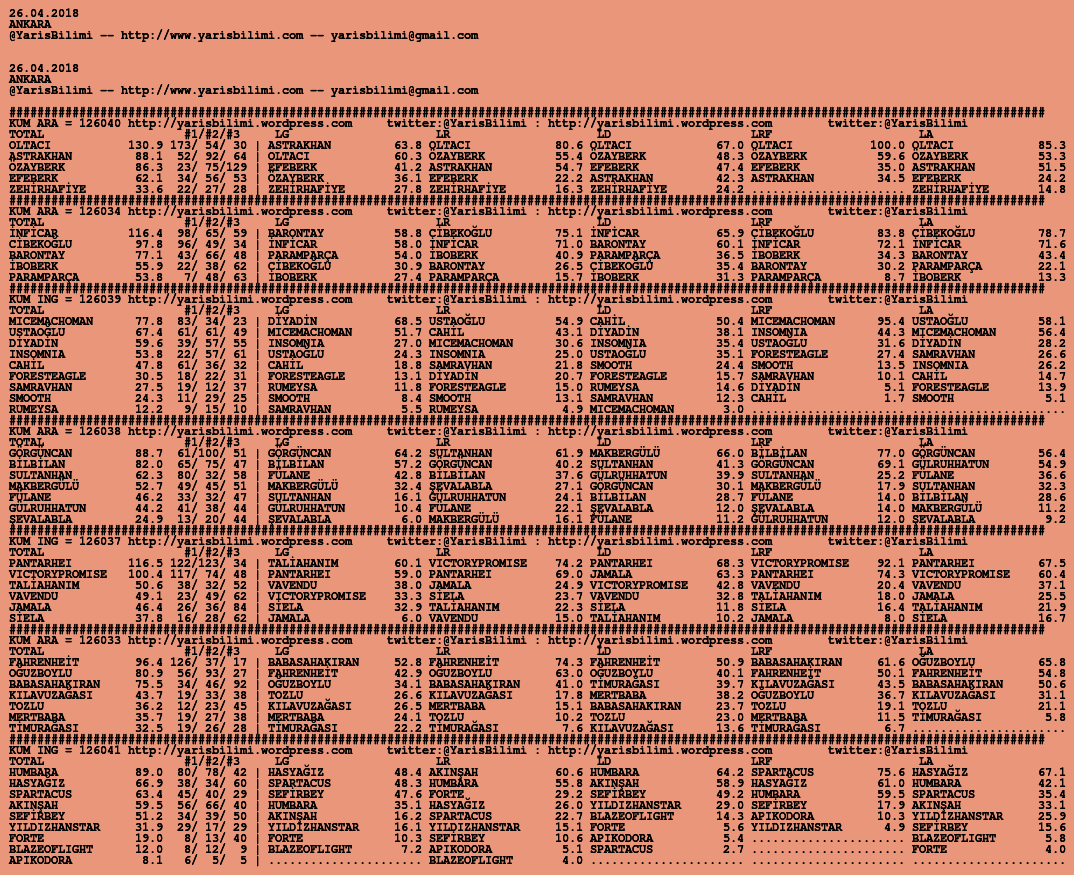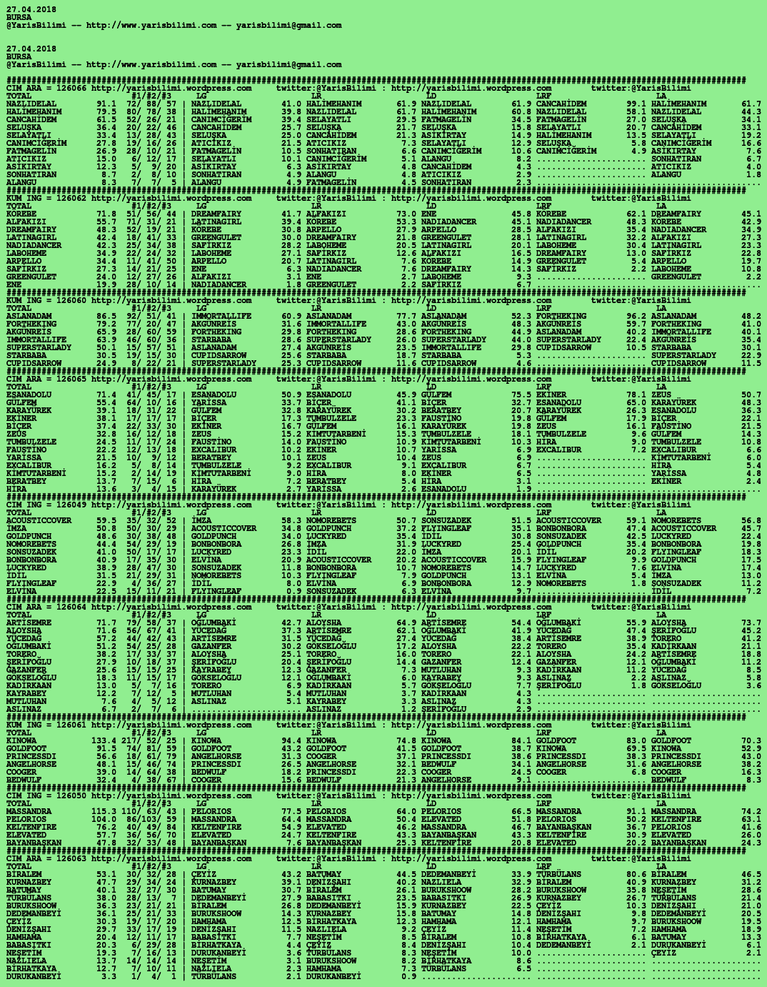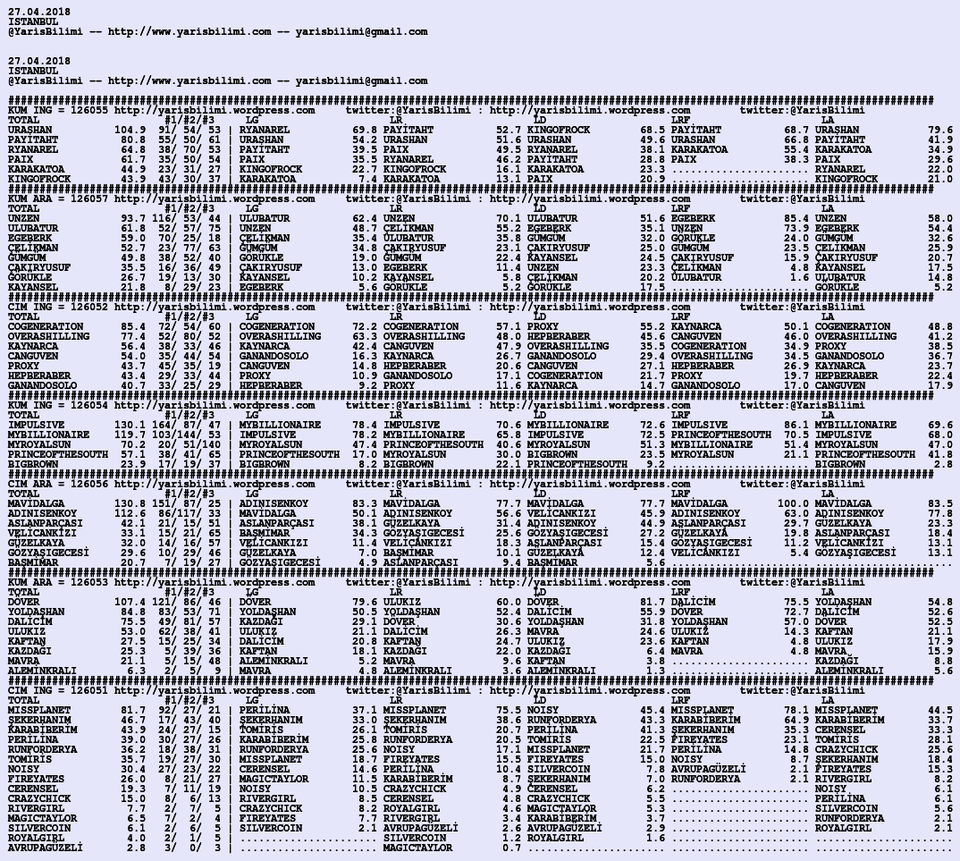 Kendi tercihlerinizi one aliniz. Bu siralamalar sizlere yardim icin hazirlanmaktadir. Ama banko, sablon tercihleriniz kisisel olmali. Eksik verileri olan atlara ozellikle dikkat edilmesini tekrarlar hepinize bol sanslar dileriz.