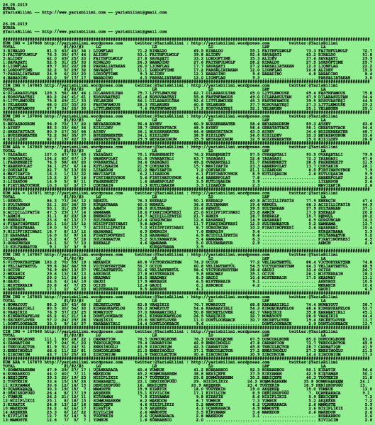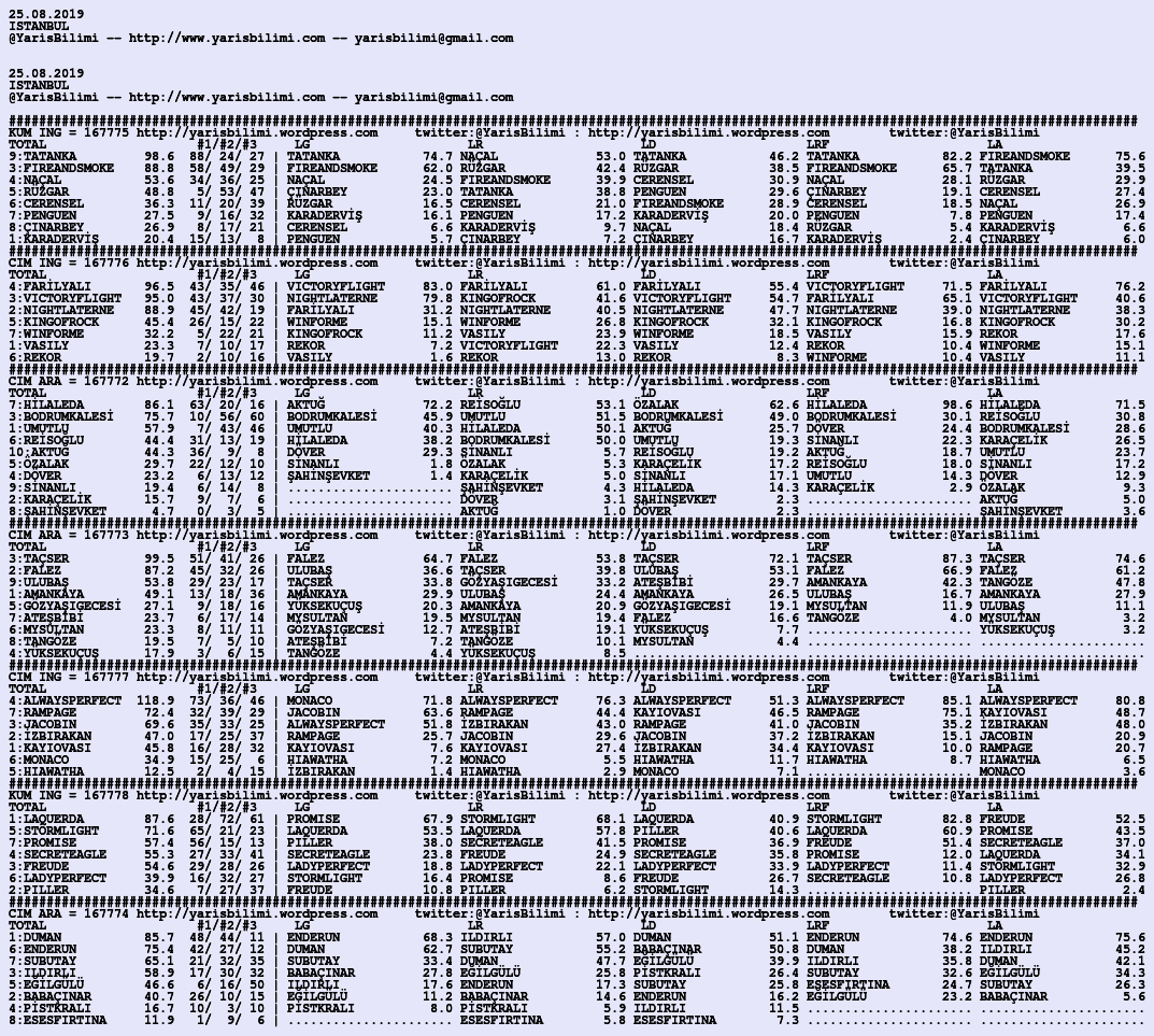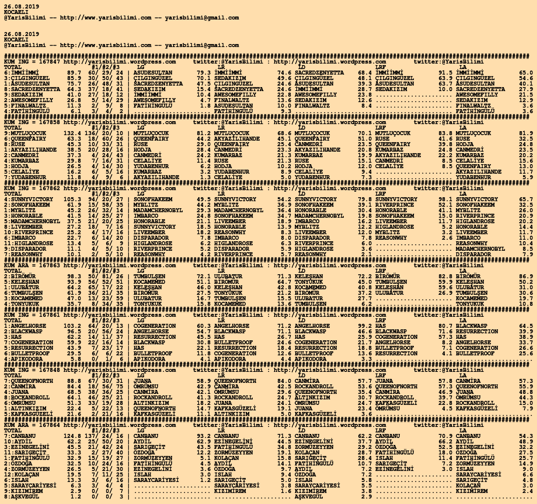 TOTAL sutunu en makul secenek. Simdilik 40 puan ustu seceneklerin sansi cok gorunuyor, ama arap yarislarinda tavsiyem 30 puan ustu. Her analizde, tahminimiz ilk ucunu degerlendirip, her turlu metod ve veri ile yapilmis onlarca simulasyonda cikan atlarin birincilik, ikincilik ve ucunculuk sayisini da (#1/#2/#3) sutunu seklinde belirtiyoruz. Butun kosular geri donusumlu verilere dayali analiz ve simule edilerek, Ilk uc gelmesi muhtemel atlara verilen puanlarla olusturulan sutunlarda mevcut.