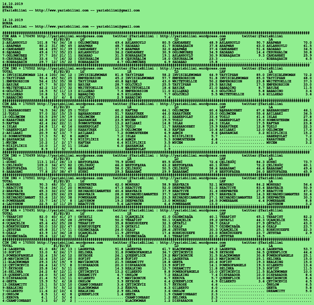 14.10.2019.BURSA tahminleri 13 Pazar Eki 2019 Posted by yarisbilimi in bursa, yorum ≈ Yorum bırakın Etiketlerbursa