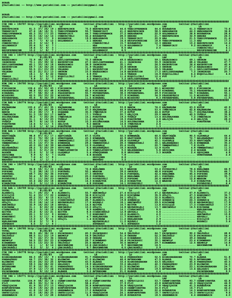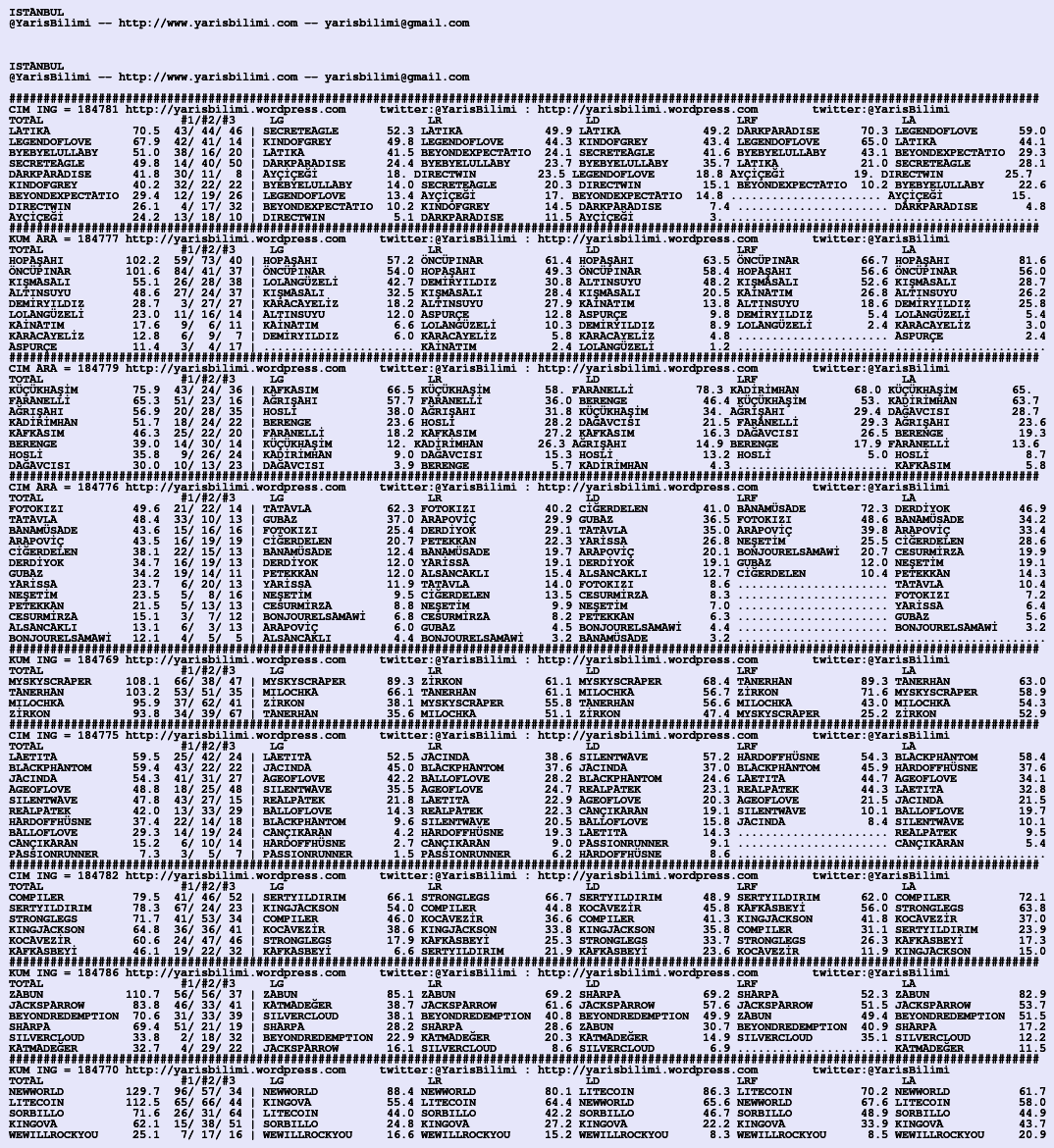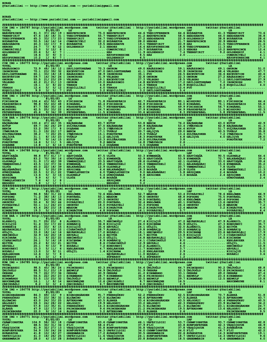 Kendi tercihlerinizi one aliniz. Bu siralamalar sizlere yardim icin hazirlanmaktadir. Ama banko, sablon tercihleriniz kisisel olmali. Eksik verileri olan atlara ozellikle dikkat edilmesini tekrarlar hepinize bol sanslar dileriz.