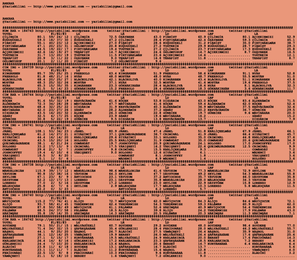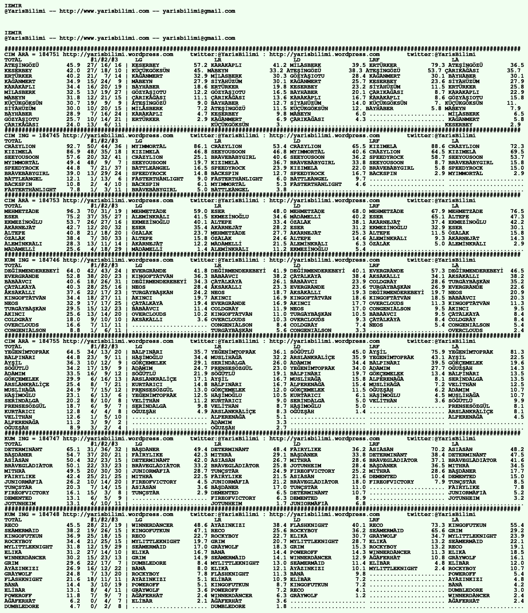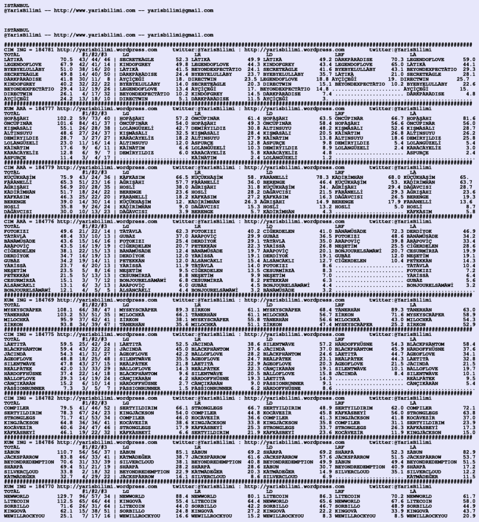 Kendi tercihlerinizi one aliniz. Bu siralamalar sizlere yardim icin hazirlanmaktadir. Ama banko, sablon tercihleriniz kisisel olmali. Eksik verileri olan atlara ozellikle dikkat edilmesini tekrarlar hepinize bol sanslar dileriz.