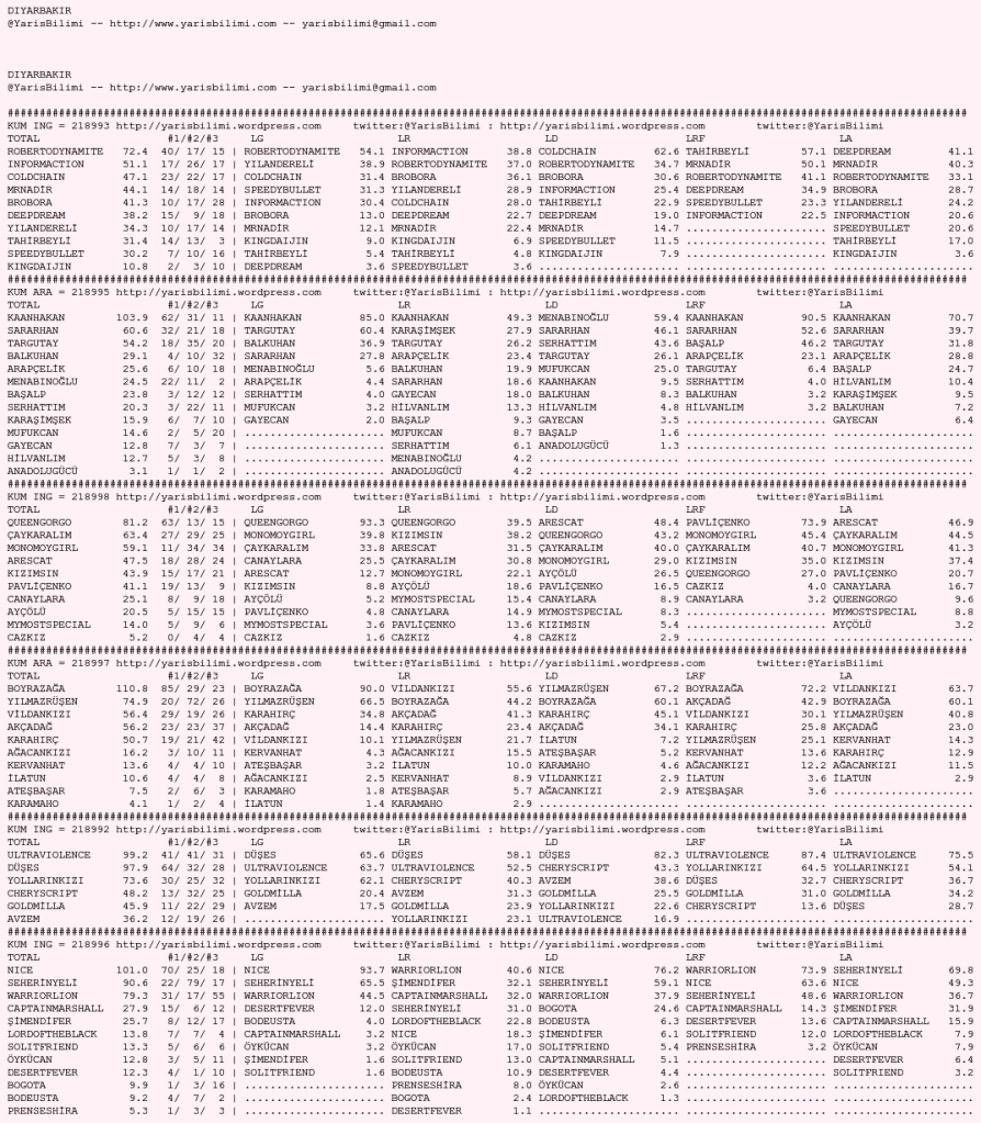 Kendi tercihlerinizi one aliniz. Bu siralamalar sizlere yardim icin hazirlanmaktadir. Ama banko, sablon tercihleriniz kisisel olmali. Eksik verileri olan atlara ozellikle dikkat edilmesini tekrarlar hepinize bol sanslar dileriz.