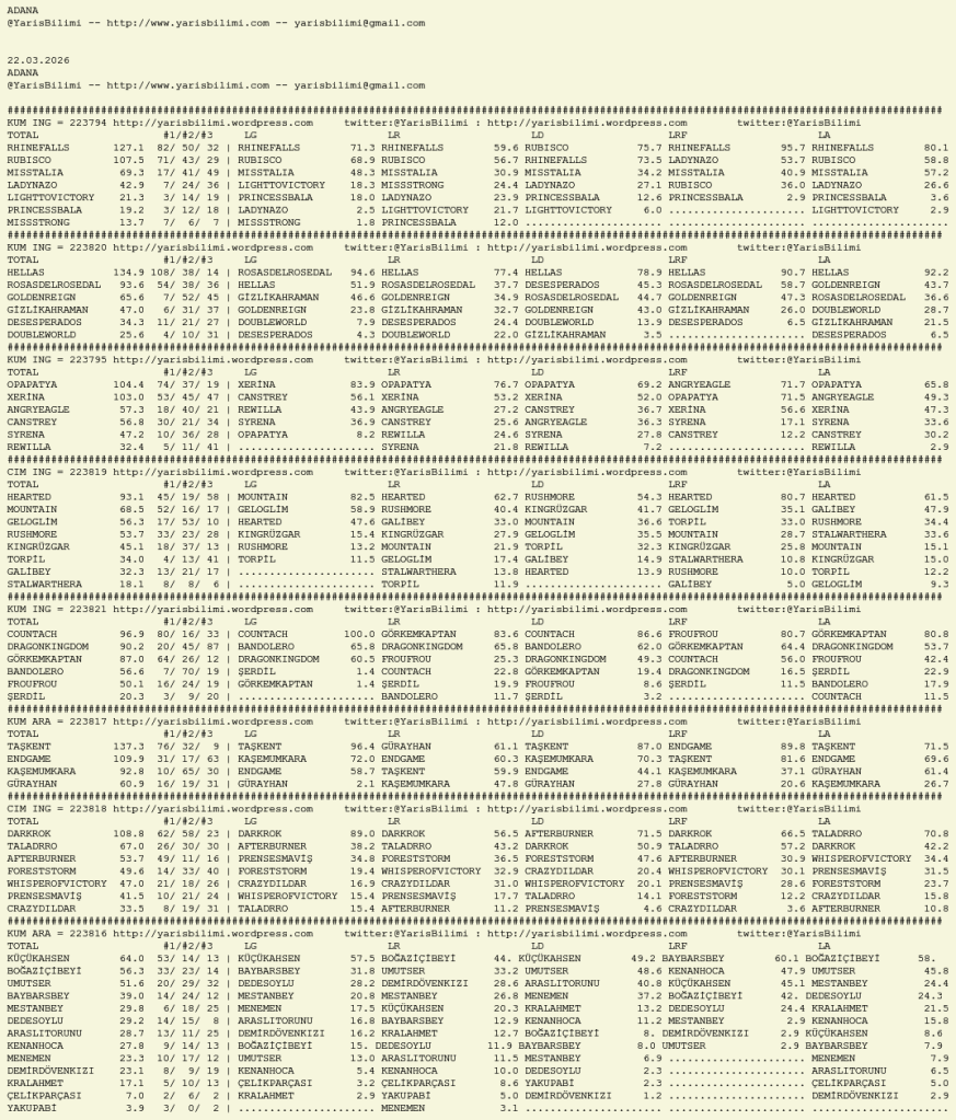 Kendi tercihlerinizi one aliniz. Bu siralamalar sizlere yardim icin hazirlanmaktadir. Ama banko, sablon tercihleriniz kisisel olmali. Eksik verileri olan atlara ozellikle dikkat edilmesini tekrarlar hepinize bol sanslar dileriz.