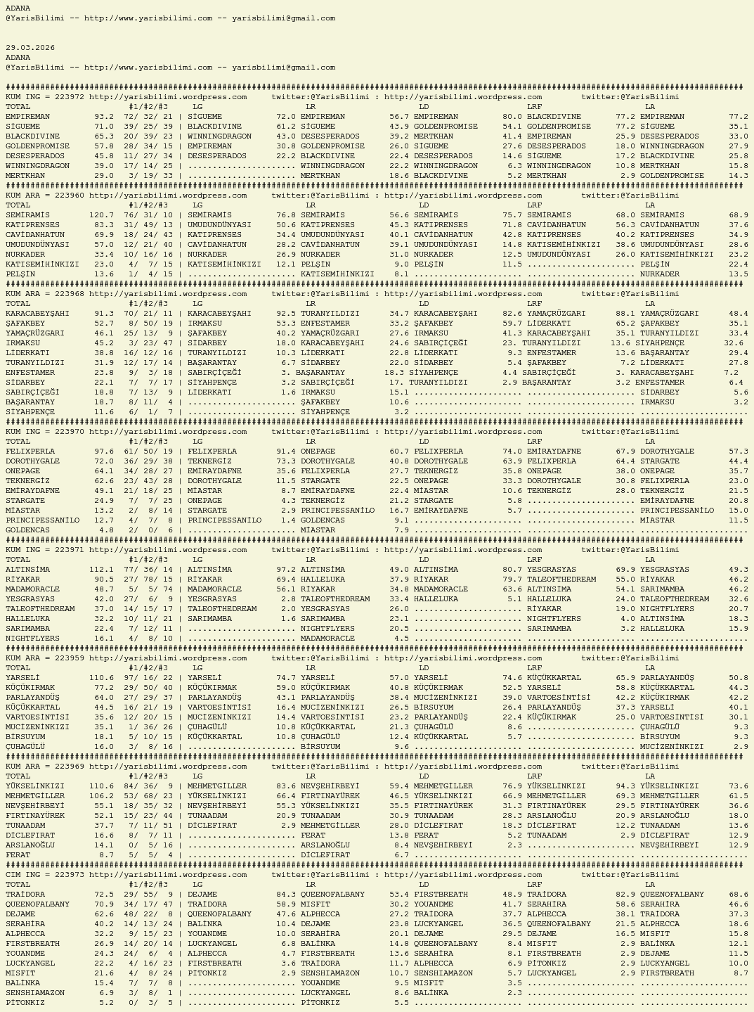 Kendi tercihlerinizi one aliniz. Bu siralamalar sizlere yardim icin hazirlanmaktadir. Ama banko, sablon tercihleriniz kisisel olmali. Eksik verileri olan atlara ozellikle dikkat edilmesini tekrarlar hepinize bol sanslar dileriz.