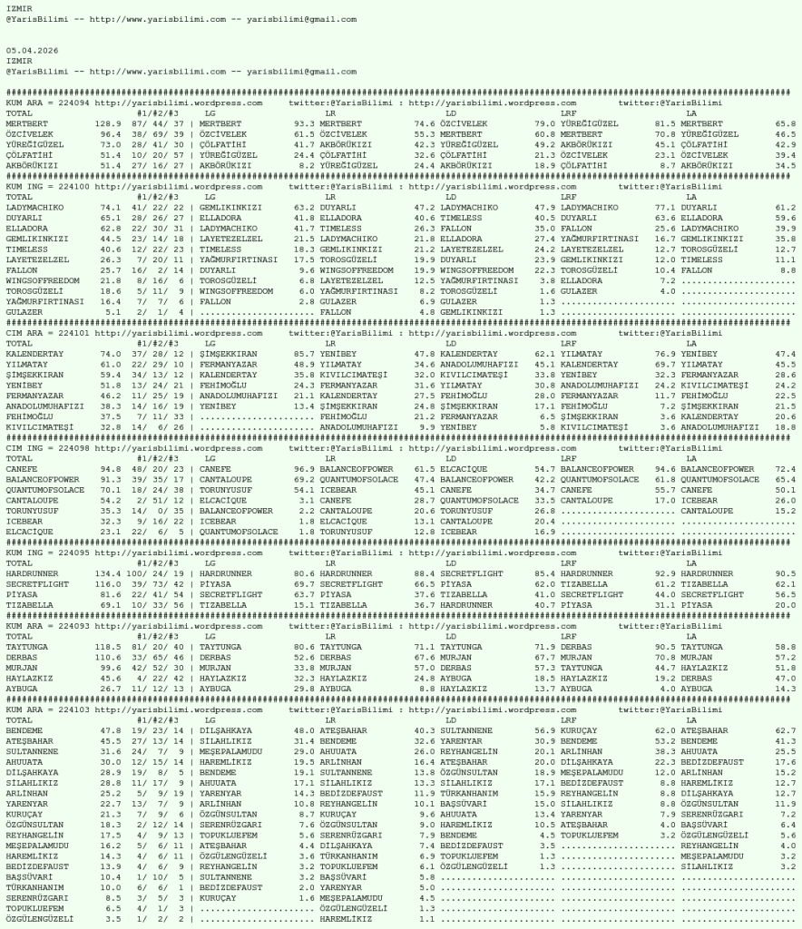 Kendi tercihlerinizi one aliniz. Bu siralamalar sizlere yardim icin hazirlanmaktadir. Ama banko, sablon tercihleriniz kisisel olmali. Eksik verileri olan atlara ozellikle dikkat edilmesini tekrarlar hepinize bol sanslar dileriz.