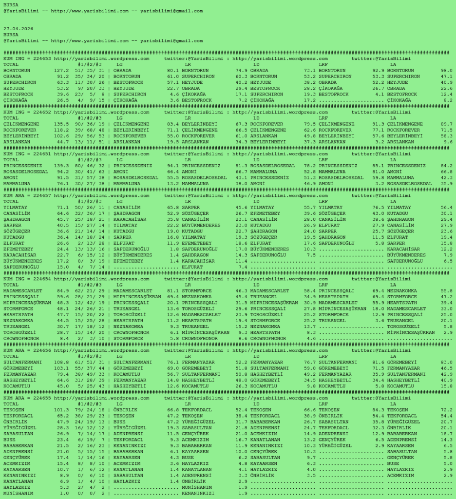 Kendi tercihlerinizi one aliniz. Bu siralamalar sizlere yardim icin hazirlanmaktadir. Ama banko, sablon tercihleriniz kisisel olmali. Eksik verileri olan atlara ozellikle dikkat edilmesini tekrarlar hepinize bol sanslar dileriz.