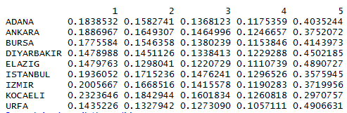 Bu sayilara gore, birinciyi tutturma oranimiz asagidaki tablodaki gibi dagilmis. Yani ADANA’da 18% ihtimalle birinciyi bulmusuz, 15.8% ihtimalle ikinci verdigimiz at gelmis, son kolon da, ilk dort’de vermedigimiz atlar icin, yani 60% ihtimalle ADANA’daki yarislarda ilk dort’te bekledigimiz at yaris kazanmis. Bu tablo ayni zamanda ELAZIG, URFA ve DIYARBAKIR’daki tahmin zorlugunu ve surpriz sonuclara gebe bu sehirlerin nasil digerlerinden ayristigini da gosteriyor.